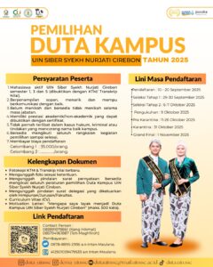 UIN Siber Cirebon — UIN Siber Syekh Nurjati Cirebon resmi membuka pendaftaran Pemilihan Duta Kampus Tahun 2025. Ajang bergengsi yang selalu ditunggu mahasiswa ini berlangsung mulai 10–20 September 2025 dan menjadi kesempatan emas bagi mahasiswa untuk menunjukkan potensi diri, kepemimpinan, dan kecintaan terhadap almamater.