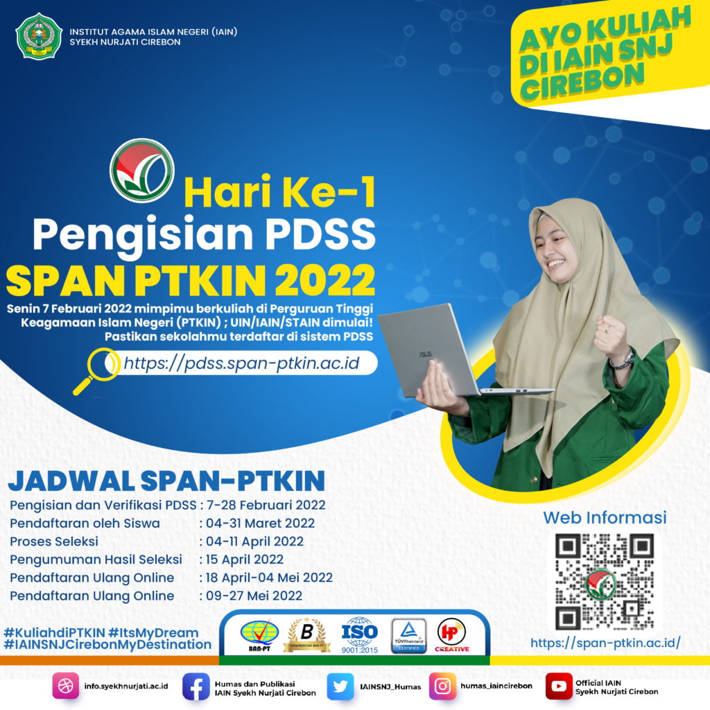 IAIN Syekh Nurjati Cirebon – Pengisian Pangkalan Data Sekolah dan Siswa (PDSS) untuk keperluan pendaftaran Seleksi Prestasi Akademik Nasional Ujian Masuk Perguruan Tinggi Keagamaan Islam Negeri (SPAN – UM PTKIN) 2022 sudah dibuka.