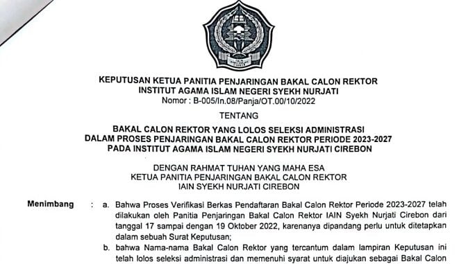 PENGUMUMAN BAKAL CALON REKTOR IAIN SYEKH NURJATI CIREBON YANG LOLOS SELEKSI ADMINISTRASI 26 Oktober 2022 arifin Pengumuman, Uncategorized 0 UNDUH PENGUMUMAN LOLOS SELEKSI ADMINISTRASI