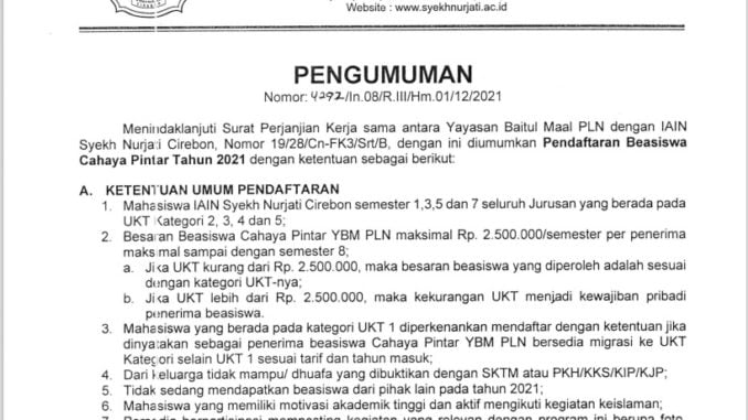 Pengumuman Beasiswa Cahaya Pintar PLN 2021 13 Desember 2021 arifin Pengumuman 0 Unduh Pengumuman dan Surat Pernyataan Pengumuman Beasiswa Cahaya Pintar Formulir Beasiswa CAHAYA PINTAR YBM PLN SURAT PERNYATAAN CAHAYA PINTAR PLN