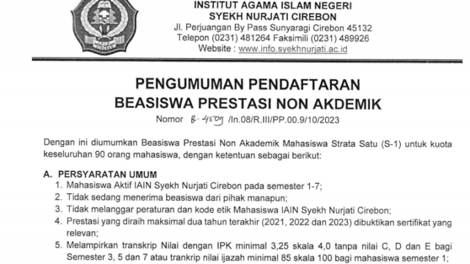 Pengumuman Beasiswa Prestasi Non Akademik 31 Oktober 2023 arifin Pengumuman 0 Unduh Pengumuman Beasiswa Prestasi Non Akademik Tahun 2023 Unduh Surat Pernyataan Tidak Sedang Menerima Beasiswa Unduh Surat Permohonan Beasiswa Prestasi Non Akademik Tahun 2023