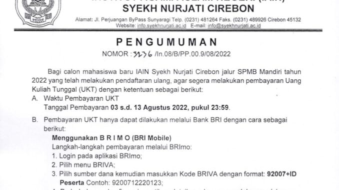 PENGUMUMAN CARA PEMBAYARAN UKT JALUR SPMB MANDIRI 3 Agustus 2022 arifin Pengumuman 0 UNDUH PENGUMUMAN PENGMUMAN CARA PEMBAYARAN UKT JALUR SPMB MANDIRI