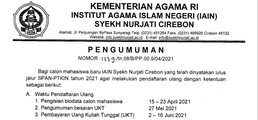 PENGUMUMAN DAFTAR ULANG JALUR SPAN 2021