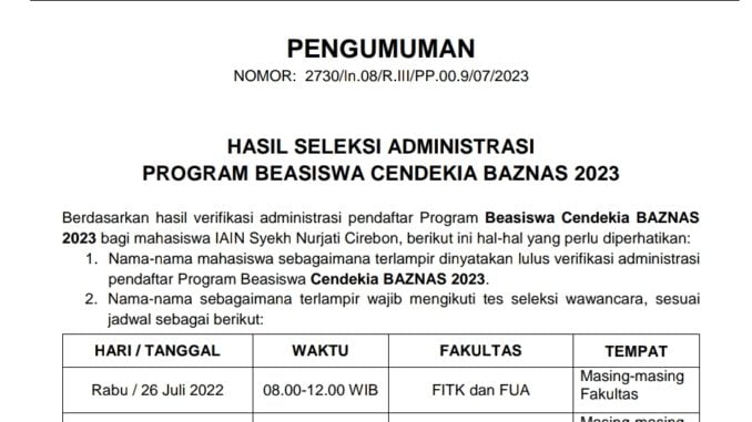 PENGUMUMAN HASIL SELEKSI ADMINISTRASI BEASISWA CENDEKIA BAZNAS 23 Juli 2023 arifin Pengumuman 0 Unduh Pengumuman PENGUMUMAN HASIL SELEKSI ADMINISTRASI BCB 2023