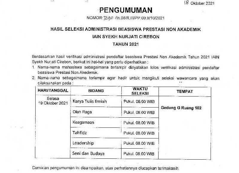 HASIL SELEKSI ADMINISTRASI BEASISWA PRESTASI NON AKADEMIK