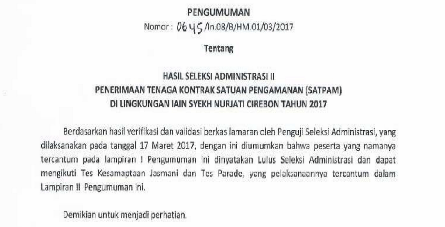 Pengumuman Hasil seleksi administrasi II Tenaga kontrak SATPAM 20 Maret 2017 arifin Informasi, Kegiatan 0 Humas dan Publikasi