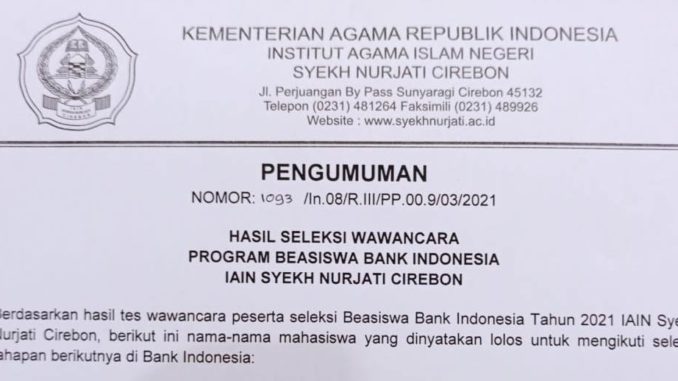 PENGUMUMAN HASIL SELEKSI BEASISWA BI IAIN SYEKH NURJATI CIREBON 24 Maret 2021 arifin Pengumuman 0 UNDUH PENGUMUMAN HASIL SELEKSI BEASISWA BI IAIN SYEKH NURJATI CIREBON Beasiswabeasiswa iainhumasdanpublikasihumasdanpublikasiiaincirebonhumasptkiniain cirebonIAIN Syekh Nurjati Cireboniaincirebonuin cirebonuinsyekhnurjaticirebonUISSIsyekhnurjaticirebon