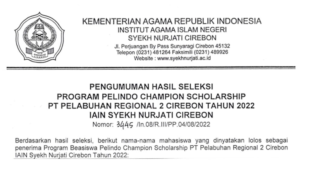 PENGUMUMAN HASIL SELEKSI PROGRAM BEASISWA PELINDO CHAMPION SCHOLARSHIP PT PELABUHAN REGIONAL 2 CIREBON TAHUN 2022 IAIN SYEKH NURJATI CIREBON