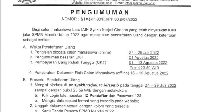 PENGUMUMAN HERREGRISTRASI SPMB MANDIRI IAIN SYEKH NURJATI CIREBON 2022 27 Juli 2022 arifin Pengumuman 0 Unduh Dokumen PENGUMUMAN HERREGRISTRASI SPMB MANDIRI 2022