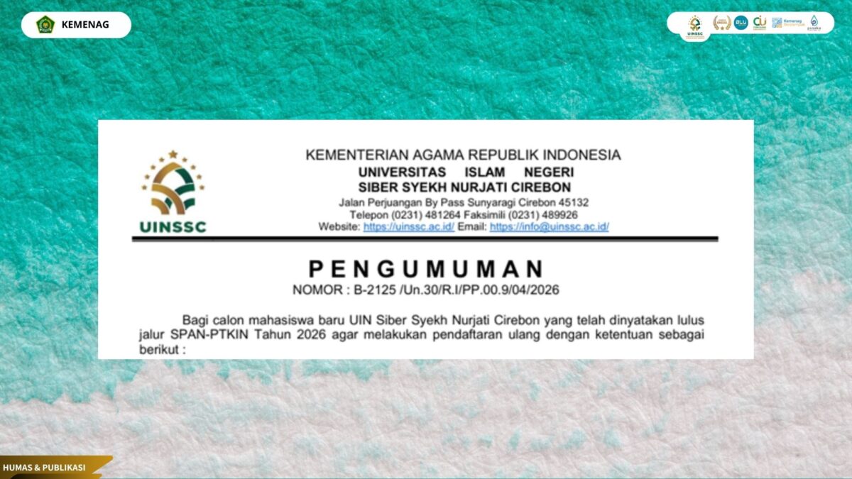 Bagi calon mahasiswa baru UIN Siber Syekh Nurjati Cirebon yang telah dinyatakan lulus jalur SPAN-PTKIN Tahun 2026 agar melakukan pendaftaran ulang dengan ketentuan sebagai berikut :