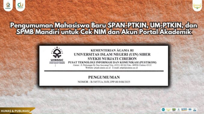 Pengumuman Mahasiswa Baru SPAN-PTKIN, UM-PTKIN, dan SPMB Mandiri untuk Cek NIM dan Akun Portal Akademik 12 Agustus 2025 arifin Informasi, Pengumuman 0 Untuk Informasi Selengkapnya Silahkan Unduh Link Dibawah ini: B-5457_Pengumuman Cek NIM Mahasiswa Baru