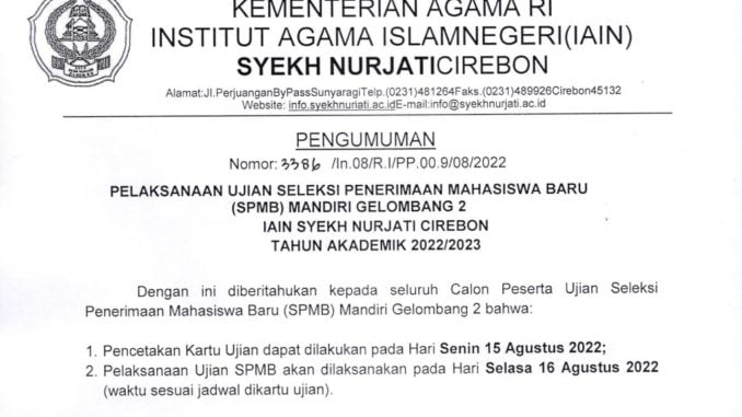 PENGUMUMAN PELAKSANAAN UJIAN SPMB MANDIRI GEL 2 TAHUN 2022 15 Agustus 2022 arifin Pengumuman 0 UNDUH PENGUMUMAN PENGUMUMAN PELAKSANAAN UJIAN SPMB MANDIRI GEL 2 TAHUN 2022