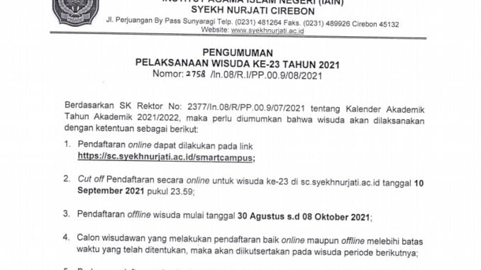 PENGUMUMAN PELAKSANAAN WISUDA KE 23 IAIN SYEKH NURJATI CIREBON 27 Agustus 2021 arifin Informasi, Pengumuman 0 UNDUH PENGUMUMAN PENGUMUMAN PELAKSANAAN WISUDA KE 23 TAHUN 2021