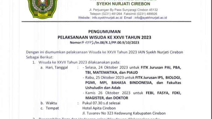 Pengumuman Pelaksanaan Wisuda ke XXVII IAIN Syekh Nurjati Cirebon tahun 2023 17 Oktober 2023 arifin Pengumuman 0 UNDUH PENGUMUMAN PELAKSANAAN WISUDA KE 27