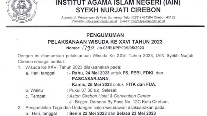 Pengumuman Pelaksanaan Wisuda Sarjana dan Magister ke XXVI IAIN Syekh Nurjati Cirebon Tahun 2023 15 Mei 2023 arifin Pengumuman 0 Unduh Pengumuman pengumuman pelaksanaan wisuda ke XXVI