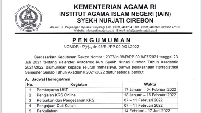 Pengumuman Pembayaran UKT IAIN Syekh Nurjati Cirebon Tahun 2022 17 Januari 2022 arifin Pengumuman 0 Unduh Pengumuman PENGUMUMAN PEMBAYARAN UKT SMT GENAP 2021-2022