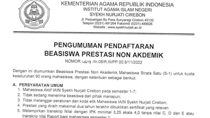 PENGUMUMAN PENDAFTARAN BEASISWA PRESTASI NON AKDEMIK IAIN SYEKH NURJATI CIREBON TAHUN 2022 3 November 2022 arifin Informasi, Pengumuman 0 Unduh Pengumuman : PENGUMUMAN PENDAFTARAN BEASISWA PRESTASI NON AKADEMIK 2022