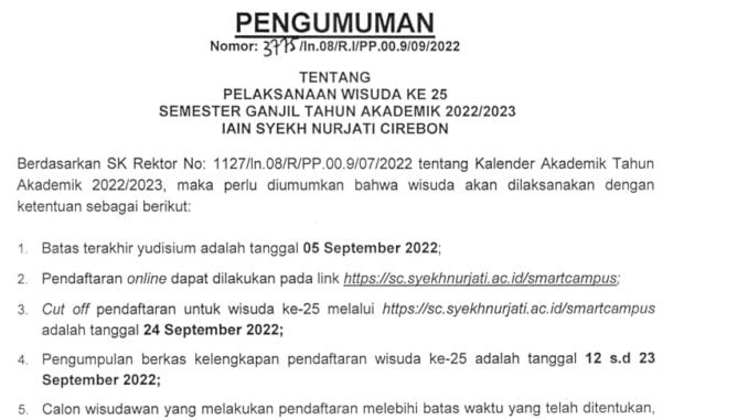Pengumuman Pendaftaran Wisuda ke 25 IAIN Syekh Nurjati Cirebon 13 September 2022 arifin Pengumuman 0 Unduh Pengumuman PENGUMUMAN WISUDA KE 25 Link Pendaftaran SMARTCAMPUS IAIN SYEKH NURJATI CIREBON Blanko Ceklis Pendaftaran Wisuda BLANKO CEKLIS PENDAFTARAN WISUDA 2022