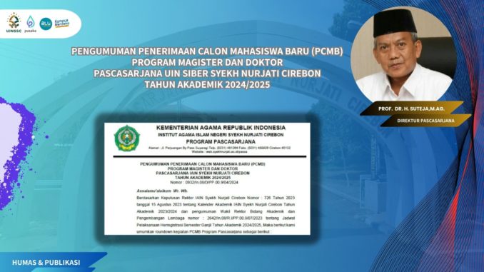 PENGUMUMAN PENERIMAAN CALON MAHASISWA BARU (PCMB) PROGRAM MAGISTER DAN DOKTOR PASCASARJANA UIN SIBER SYEKH NURJATI CIREBON TAHUN AKADEMIK 2024/2025 10 Juli 2024 arifin Informasi, Pengumuman 0 Untuk Informasi Selengkapnya Silahkan Unduh Link dibawah ini: PENGUMUMAN Rundown PCMB Program Pascasarjana 2024 #KementerianAgamari#LayananAkademikUINSiberCirebon#Pendisri#ProgramDoktorPascasarjanaUINSiberCirebon#ProgramMagisterPaascasarjanaUINSiberCirebon#PTIPDUINSiberCirebon#uinssckepegawaianuinsibersyekhnurjaticirebon