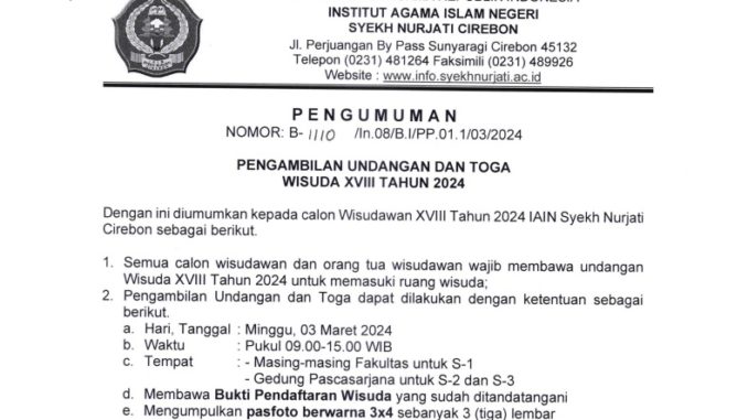 PENGUMUMAN PENGAMBILAN UNDANGAN DAN TOGA WISUDA XVIII TAHUN 2024 1 Maret 2024 arifin Berita, Informasi 0 Untuk Informasi Selengkapnya Silahkan Unduh Link dibawah ini : pengumuman pengambilan toga wisuda 28
