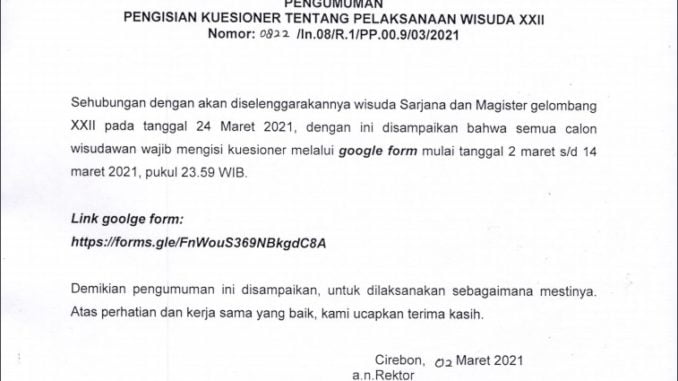 PENGUMUMAN PENGISIAN KUISIONER WISUDA XXII IAIN SYEKH NURJATI CIREBON 3 Maret 2021 arifin Informasi, Pengumuman 0 LINK PENGISIAN KUISIONER WISUDA IAIN SYEKH NURJATI CIREBON XXII https://forms.gle/FnWouS369NBkgdC8A UNDUH PENGUMUMAN ND PENGUMUMAN KUESIONER WISUDA XXII03032021102739 humasdanpublikasihumasdanpublikasiiaincirebonhumasptkinIAIN Syekh Nurjati Cireboniaincirebonuin cirebonuinsyekhnurjaticirebon