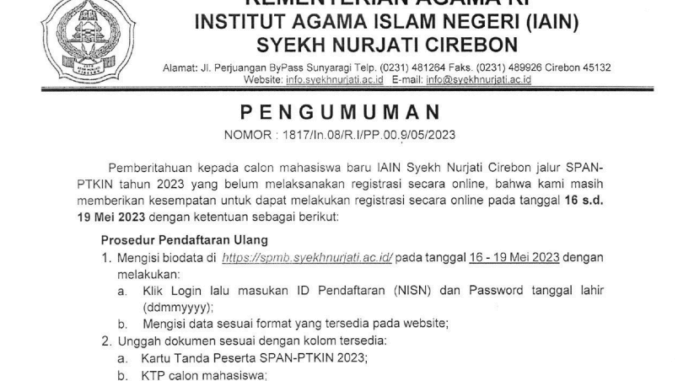 Pengumuman Perpanjangan Daftar Ulang Mahasiswa Jalur SPAN PTKIN 17 Mei 2023 arifin Pengumuman 0 UNDUH PENGUMUMAN PENGUMUMAN PERPANJANGAN DAFTAR ULANG MABA JALUR SPAN PTKIN 2023