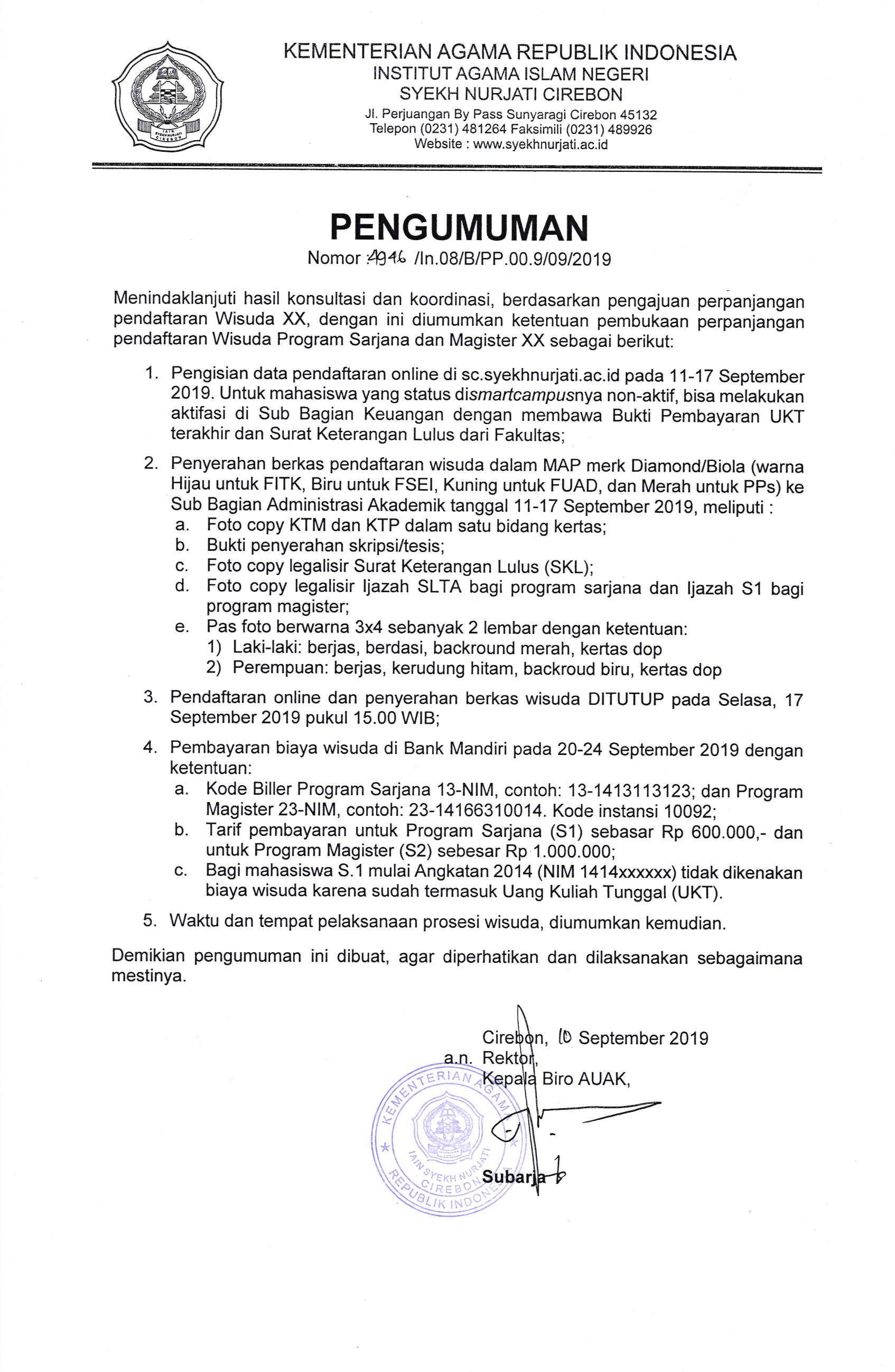Bagi Calon Wisudawan yang sudah mendaftar pada 18 Agustus 2019 s.d. 06 September 2019, jadwal pembayaran wisuda tetap mengikuti pengumuman sebelumnya, yaitu mulai 11 September 2019 s.d. 17 September 2019.