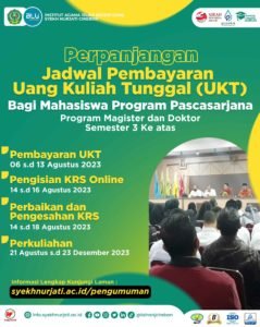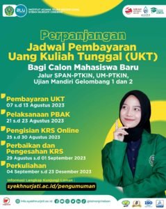 Berdasarkan Pengumuman Nomor 2642/ln.08/R/PP.00.9/07/2023 tanggal 12 Juli 2023 tentang Perubahan Jadwal Pelaksanaan Herregistrasi Semester Ganjil Tahun Akademik 2023/2024 dan Pengumuman Nomor 2967/ln.08/R/PP.00.9/08/2023 Tanggal 31 Juli 2023 tentang pembayaran Uang Kuliah Tunggal (UKT) bagi jalur SPAN-PTKIN, UM-PTKIN, Jalur Ujian Mandiri Gelombang 1 dan Jalur Ujian Mandiri Gelombang 2 Tahun Akademik 2023/2024, selanjutnya diumumkan kepada seluruh calon mahasiswa baru, bahwa Pembayaran Uang Kuliah Tunggal (UKT) diperpanjang