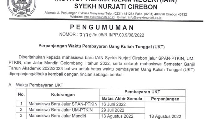 Pengumuman Perpanjangan waktu Pembayaran UKT 12 Agustus 2022 arifin Pengumuman, Uncategorized 0 Unduh Pengumuman PENGUMUMAN PERPANJANGAN WAKTU PEMBAYARAN UKT