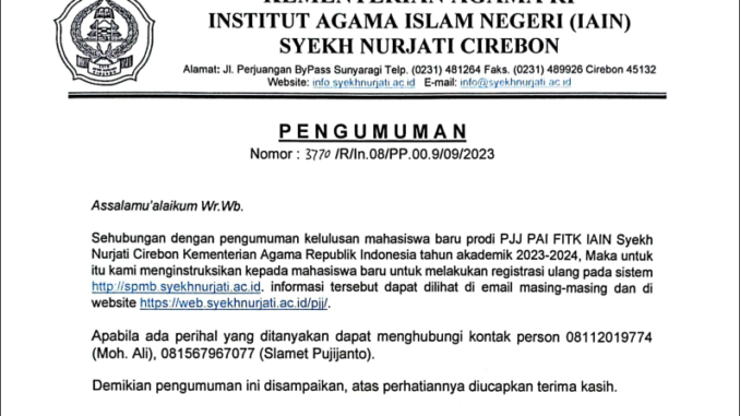 PENGUMUMAN REGISTRASI ULANG MAHASISWA BARU PJJ PAI 15 September 2023 arifin Pengumuman 0 UNDUH PENGUMUMAN KELULUSAN MHS PJJ PAI 2023-2024