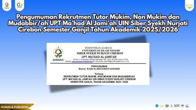 Pengumuman Rekrutmen Tutor Mukim, Non Mukim dan Mudabbir/ah UPT Ma’had Al Jami’ah UIN Siber Syekh Nurjati Cirebon Semester Ganjil Tahun Akademik 2025/2026 21 Juni 2025 arifin Pengumuman 0 Untuk Informasi Selngkapnya Silahkan Unduh Link Dibawah ini: Rekrutmen tutor&mudabir-oh Ganjil 25-26