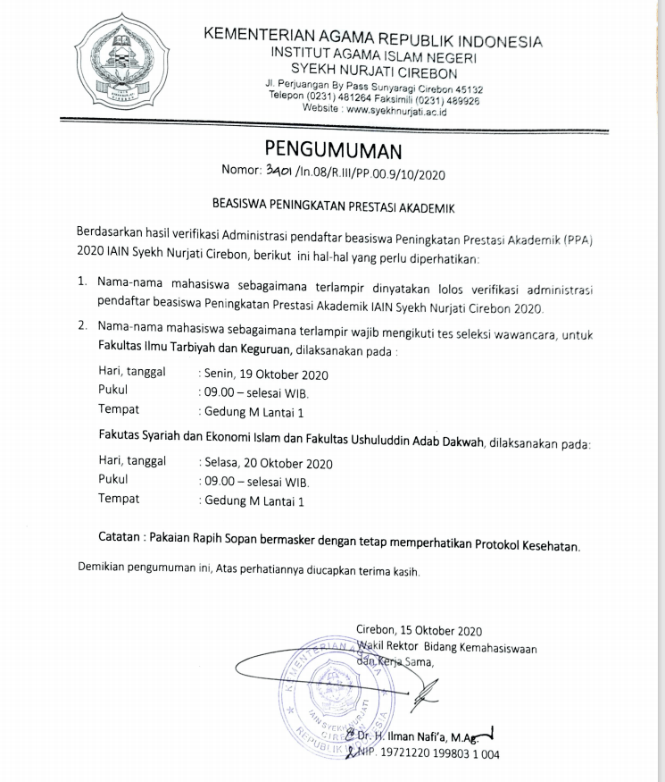 Pengumuman Seleksi Beasiswa Peningkatan Prestasi Akademik 16 Oktober 2020 arifin Pengumuman 0 Unduh Pengumuman dan Lampiran Wawancara Seleksi Beasiswa PPA AkademikhumasdanpublikasiIAIN Syekh Nurjati CirebonUINuinsyekhnurjaticirebon