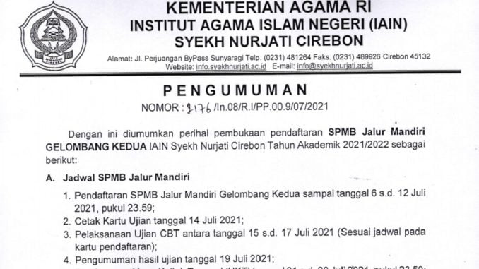Pengumuman SPMB Mandiri Gelombang II IAIN Syekh Nurjati Cirebon tahun 2021 7 Juli 2021 arifin Informasi, Pengumuman 0 Unduh Pengumuman pengumuman spmb mandiri gel II 2021 revisi07062021170612