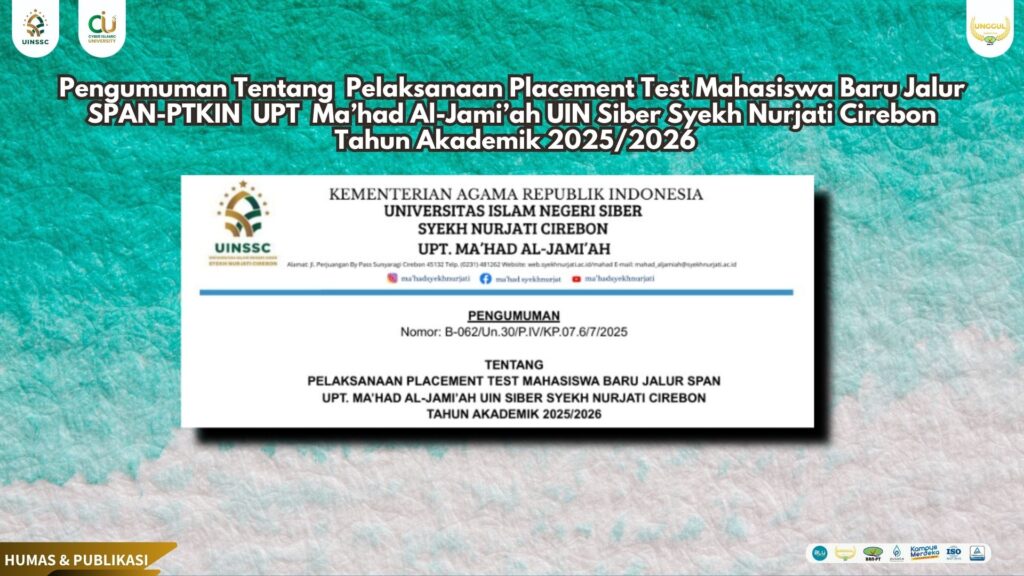 Pengumuman Tentang Pelaksanaan Placement Test Mahasiswa Baru Jalur SPAN-PTKIN UPT Ma’had Al-Jami’ah Uin Siber Syekh Nurjati Cirebon Tahun Akademik 2025/2026