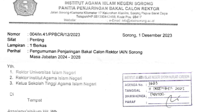 Penjaringan Bakal Calon Rektor IAIN Sorong Masa Jabatan 2024-2028 11 Desember 2023 arifin Berita, Pengumuman 0 Download Pengumuman penjaringan calon rektor sorong