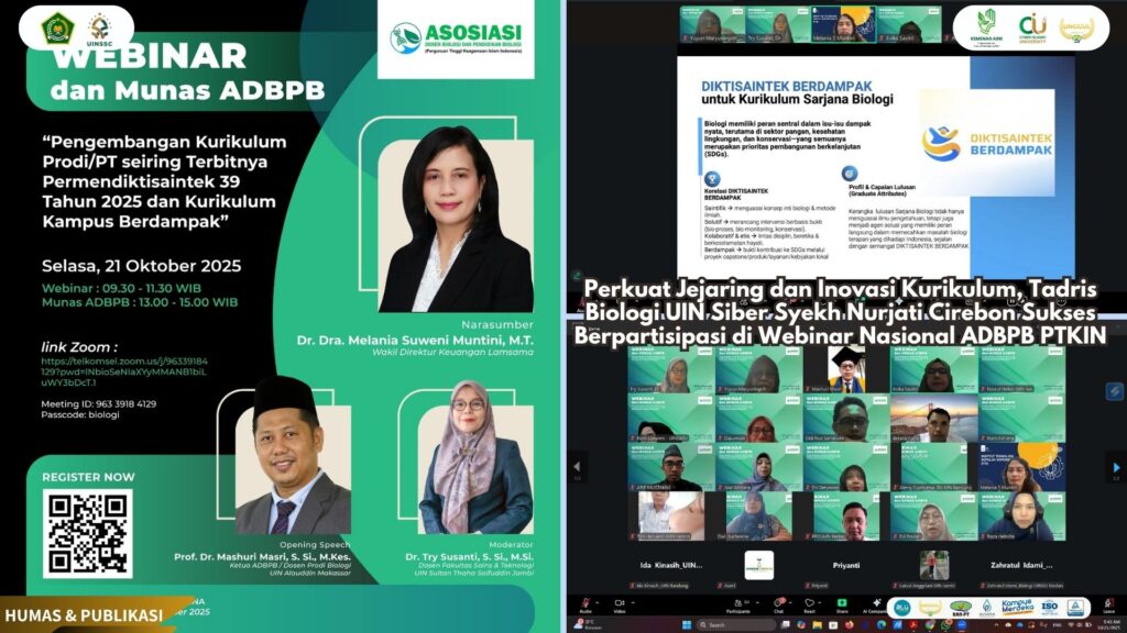 UIN Siber Cirebon – Program Studi Tadris Biologi Fakultas Ilmu Tarbiyah dan Keguruan UIN Siber Syekh Nurjati Cirebon menunjukkan komitmennya dalam memperkuat inovasi pendidikan dan jejaring akademik melalui partisipasi aktif dalam Webinar dan Musyawarah Nasional Asosiasi Dosen Biologi dan Pendidikan Biologi (ADBPB) PTKIN, yang diselenggarakan secara daring pada Selasa, 21 Oktober 2025.