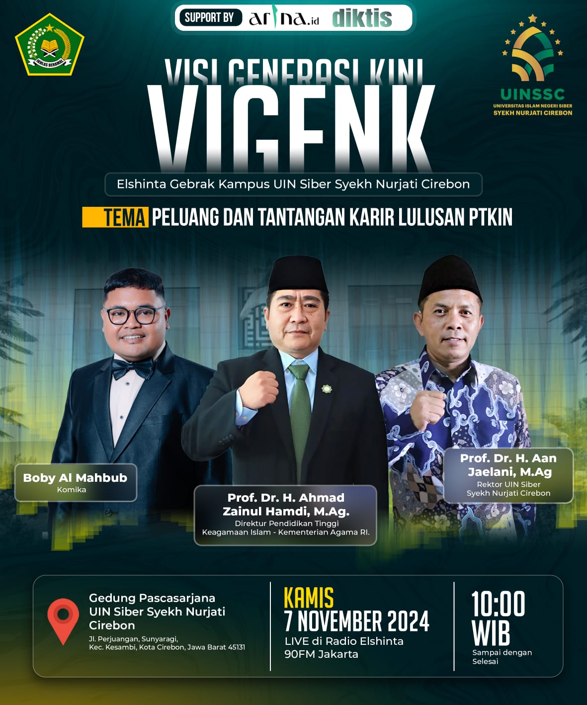 Untuk membekali pengetahuan tentang masa depan lulusan PTKIN, dalam ‘Gebrak Kampus 2024’ ini UIN Siber Syekh Nurjati Cirebon menggandeng Radio Elshinta dan Arina.id. Setelah event ini para mahasiswa diberi kesempatan untuk magang di radio guna belajar tentang ilmu broadcasting, public speaking sekaligus praktik siaran.
