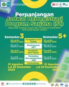 Berdasarkan Pengumuman Nomor : 2642/In.08/R.I/PP.00.9/07/2023 Tanggal 12 Juli 2023 tentang Herregistrasi Program Sarjana, Magister dan Doktor Tahun Akademik 2023/2024 diumumkan kepada seluruh mahasiswa, bahwa ada perpanjangan jadwal pelaksanaan Herregistrasi Semester Ganjil Tahun Akademik 2023/2024.