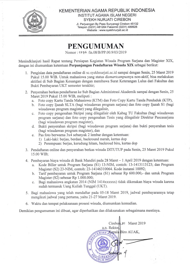 Perpanjangan Pendaftaran Wisuda XIX IAIN Syekh Nurjati Cirebon 21 Maret 2019 arifin Informasi 0 AkademikHumas dan Publikasi