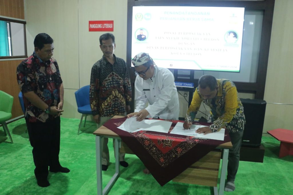 Perpustakaan Pusat Institut Agama Islam Negeri (IAIN) Syekh Nurjati Cirebon bersama dengan Dinas Perpustakaan dan Kearsipan Kota Cirebon menyelenggarakan kerjasama (MoA) dalam rangka meningkatakan mutu pelayanan sesuai dengan visi dan misi masing-masing instansi pemerintah, saling berkolaborasi meningkatkan pelayanan kepada masyarakat/mahasiswa. Kegiatan tersebut dilaksanakan di ruang pertemuan Perpustakaan Pusat IAIN Syekh Nurjati Cirebon dan dihadiri oleh Prof. Dr. Hajam, M. Ag (Wakil Rektor III IAIN Syekh Nurjati Cirebon), Syibli Maufur, M. Pd (Kepala Pusat Perpustakaan IAIN Syekh Nurjati Cirebon) didampingi staff, Gunawan, ATD., DEA (Kepala Dinas Perpustakaan dan Kearsipan Kota Cirebon) didampingi pejabat dan staff serta tamu undangan. Kamis (07-03-24)