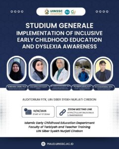UIN Siber Cirebon — Jurusan Pendidikan Islam Anak Usia Dini (PIAUD) Universitas Islam Negeri (UIN) Siber Syekh Nurjati Cirebon sukses menyelenggarakan Studium Generale 2025 bertajuk “Implementasi Pendidikan Inklusif Anak Usia Dini dan Kesadaran atas Disleksia” pada Kamis (16/10/2025). Kegiatan ini dilaksanakan secara hybrid — luring di Auditorium Lantai 5 FITK dan daring melalui Zoom Meeting — dengan menghadirkan narasumber nasional dan internasional dari berbagai bidang keilmuan.