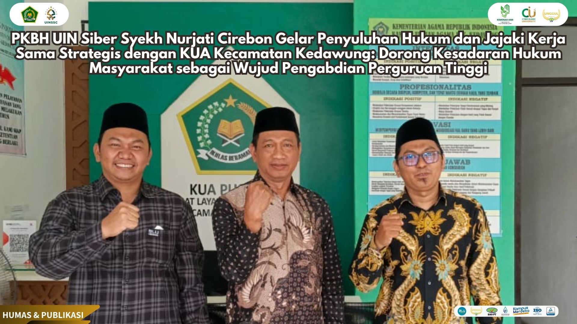 UIN Siber Cirebon (Kedawung) — Dalam rangka meningkatkan literasi dan kesadaran hukum di tengah masyarakat, Pusat Konsultasi dan Bantuan Hukum (PKBH) UIN Siber Syekh Nurjati Cirebon menggelar kegiatan Penyuluhan Hukum sekaligus penjajakan kerja sama dengan Kantor Urusan Agama (KUA) Kecamatan Kedawung, Kabupaten Cirebon. Kegiatan ini berlangsung di kantor KUA Kecamatan Kedawung, yang berlokasi di Blok Gg. Sijombang No. 359, Kertawinangun, Kedawung, Cirebon, Jawa Barat.(05/11).