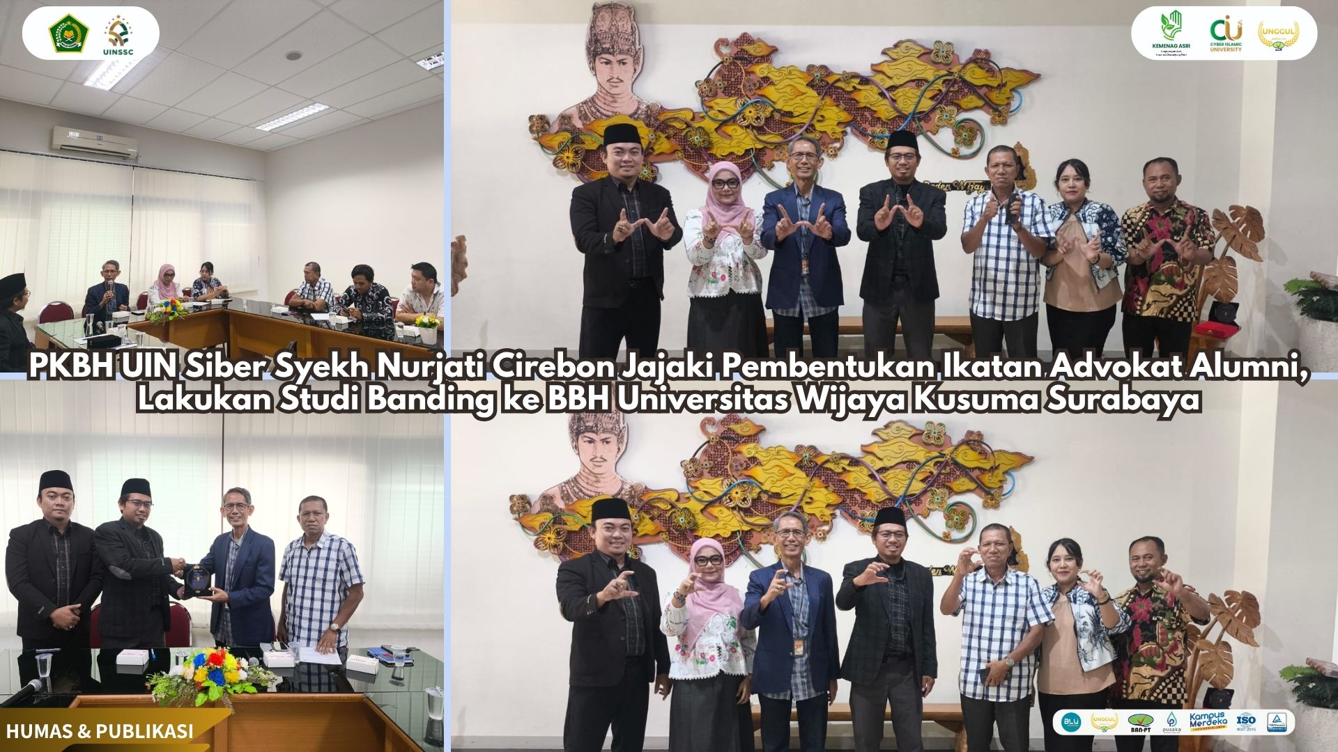 UIN Siber Cirebon (Surabaya) — Dalam upaya memperkuat jejaring kelembagaan dan meningkatkan kapasitas layanan bantuan hukum kampus, Pusat Konsultasi dan Bantuan Hukum (PKBH) UIN Siber Syekh Nurjati Cirebon melaksanakan kunjungan kelembagaan dan studi banding ke Biro Bantuan Hukum (BBH) Fakultas Hukum Universitas Wijaya Kusuma Surabaya (UWKS). Kegiatan yang berlangsung di Kampus FH UWKS, Jl. Dukuh Kupang XXV No. 54, Surabaya, ini juga menjadi momentum penjajakan pembentukan Ikatan Advokat Alumni UIN Siber Syekh Nurjati Cirebon di bawah koordinasi PKBH.(05/11).