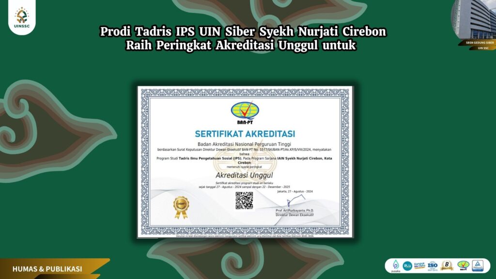 Dalam hasil yang diumumkan baru-baru ini, Program Studi Tadris Ilmu Pengetahuan Sosial (IPS) di bawah Fakultas Ilmu Tarbiyah dan Keguruan (FITK) UIN Siber Syekh Nurjati Cirebon berhasil meraih peringkat Akreditasi Unggul. Berdasarkan Surat Keputusan Direktur Dewan Eksekutif BAN-PT No. 5577/SK/BAN-PT/Ak.KP/S/VIII/2024, Tadris IPS dinyatakan memenuhi syarat untuk peringkat tersebut. Sertifikat akreditasi ini berlaku mulai tanggal 27 Agustus 2024 hingga 22 Desember 2025.
