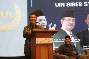 Dalam sambutannya yang inspiratif, Prof. Sahiron menyampaikan tiga bentuk apresiasi atas capaian UIN Siber: