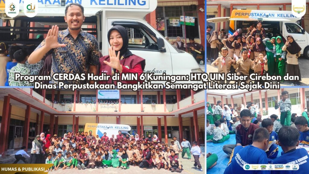 UIN Siber Cirebon (Kuningan) – Sebanyak 300 siswa MI Negeri 6 Kuningan tampak antusias mengikuti kegiatan CERDAS (Cinta Edukasi, Rajin, dan Suka Membaca) yang digelar oleh Unit Kegiatan Mahasiswa Hayy’atu Tahfidzil Qur’an (UKM HTQ) UIN Siber Syekh Nurjati Cirebon, bekerja sama dengan Dinas Kearsipan dan Perpustakaan Kabupaten Kuningan. Kegiatan ini merupakan bagian dari program HTQ Mengabdi 2025 yang bertujuan menumbuhkan budaya literasi sejak usia dini melalui perpustakaan keliling.(31/07).