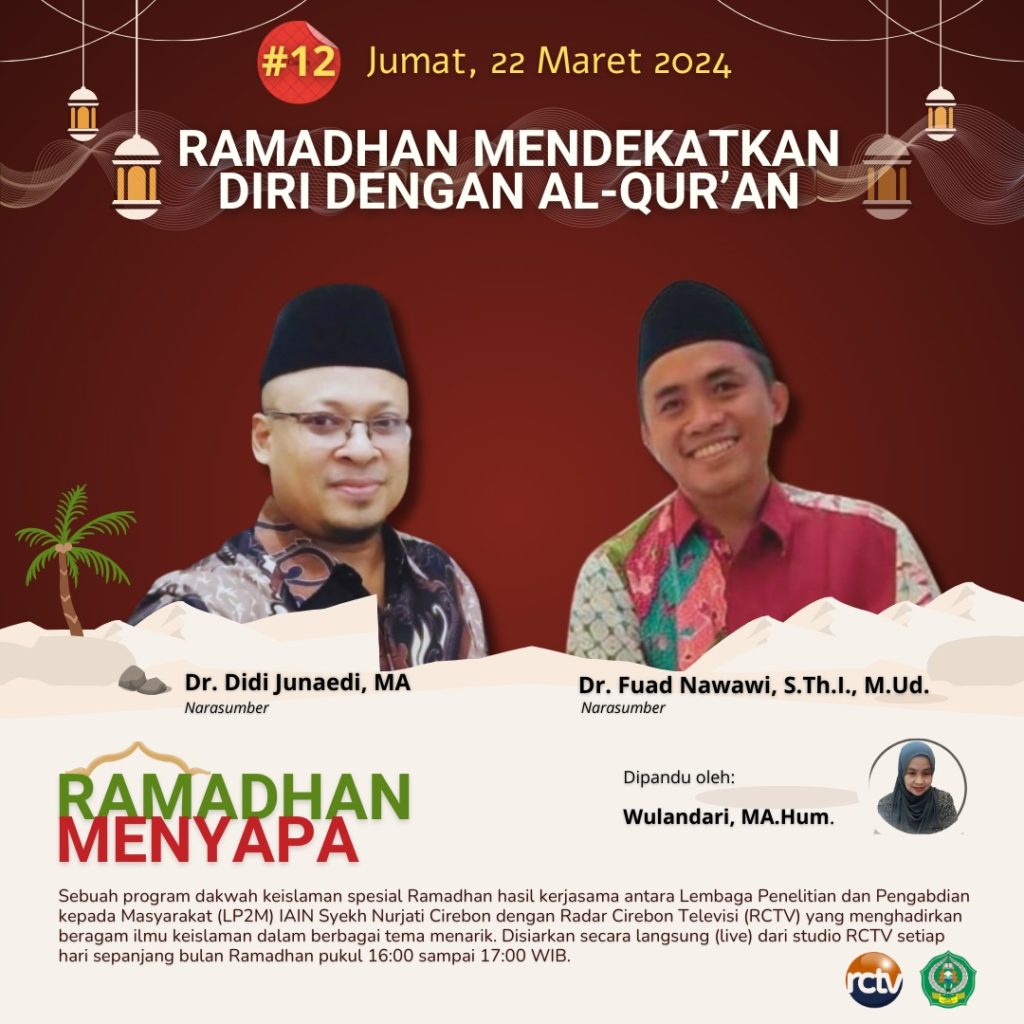 IAIN Cirebon – Kegiatan “Ramadhan Menyapa” hari keduabelas, Jum’at, 22 Maret 2024, terus menyuguhkan hikmah dan ilmu keislaman dalam berbagai tema menarik. Program ini merupakan hasil kerja sama antara Lembaga Penelitian dan Pengabdian kepada Masyarakat (LP2M) IAIN Syekh Nurjati Cirebon dengan Radar Cirebon Televisi (RCTV), yang bertujuan untuk memperdalam pemahaman masyarakat terhadap ajaran Islam, khususnya menjelang bulan suci Ramadhan.