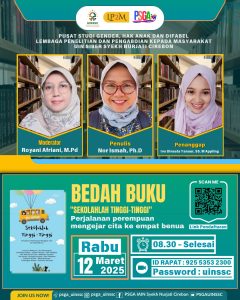 UIN Siber Cirebon – Pusat Studi Gender dan Anak (PSGA) Universitas Islam Negeri (UIN) Siber Syekh Nurjati Cirebon, yang juga dikenal dengan nama Cyber Islamic University (CIU), kembali menggelar seminar online yang menarik pada Rabu, 12 Maret 2025. Tema seminar kali ini adalah bedah buku “Sekolahlah Tinggi-Tinggi: Perjalanan Perempuan Mengejar Cita ke Empat Benua”. Acara ini dihadiri oleh lebih dari 40 peserta, yang terdiri dari tenaga pengajar PTKI di Indonesia, praktisi DPPKBP3A, Motekar Kabupaten Cirebon, dosen UIN SSC, serta peserta umum lainnya.