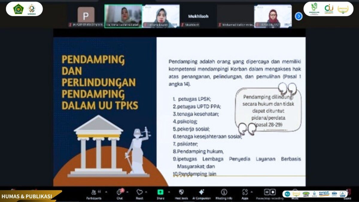 Dimulai pukul 08.00 WIB, webinar ini turut menyoroti urgensi kebijakan hukum yang berpihak kepada korban kekerasan seksual, terutama melalui implementasi Undang-Undang Nomor 12 Tahun 2022 tentang Tindak Pidana Kekerasan Seksual (UU TPKS). Kegiatan diawali dengan menyanyikan lagu Indonesia Raya dan dilanjutkan sambutan Ketua PSGAD, Masriah, M.Ag., yang menegaskan pentingnya sinergi antara lembaga pendidikan dan masyarakat dalam menciptakan ruang aman yang adil gender.