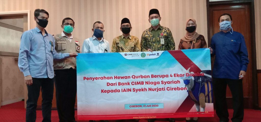 PT. Bank Cimb Niaga Syariah melalui Assistant Vice President Branch Manager Bank CIMB Syariah Cirebon, Budi Martono secara simbolis menyerahkan bantuan 4 ekor kambing qurban yang diteima langsung oleh Dr. H. Sumanta, M.Ag (Rektor IAIN Syekh Nurjati Cirebon) di ruang rektorat. Assistant Vice President Branch Manager Bank CIMB Syariah Cirebon, Budi Martono mengatakan, pemberian hewan qurban ini merupakan program rutin yang diselenggarakan setiap tahun. “Program setiap tahun, kami ingin memberikan ke pihak yang memiliki nilai historis dengan kami. Terlebih, IAIN Syekh Nurjati Cirebon ini adalah kampus negeri satu-satunya di Cirebon yang telah banyak melahirkan guru untuk mencerdaskan umat dan bangsa,” Bahkan, lanjut beliau, pihaknya pun telah beberapa kali melakukan aksi sosial dengan kampus ini, khususnya dengan Lembaga Penelitian dan Pengabdian kepada Masyarakat (LP2M) IAIN Syekh Nurjati Cirebon untuk memberikan bantuan bagi masyarakat yang terdampak Covid-19″. Selain itu, pihaknya juga telah memiliki grand design yang lebih besar antara Bank CIMB Niaga Syariah dengan IAIN Syekh Nurjati Cirebon dalam menyelenggarakan kegiatan sosial lainnya. Untuk itu, penyerahan hewan qurban ini menjadi salah satu pijakan awal untuk kegiatan-kegiatan lainnya. “Di bidang akademik, bahwa kita juga bisa memberikan beasiswa untuk mahasiswa IAIN Syekh Nurjati Cirebon, karena mungkin mahasiswa kesulitan di masa pandemi Covid-19 ini. Kemudian renovasi masjid, dan masih banyak lagi kegiatan sosial lainnya.”
